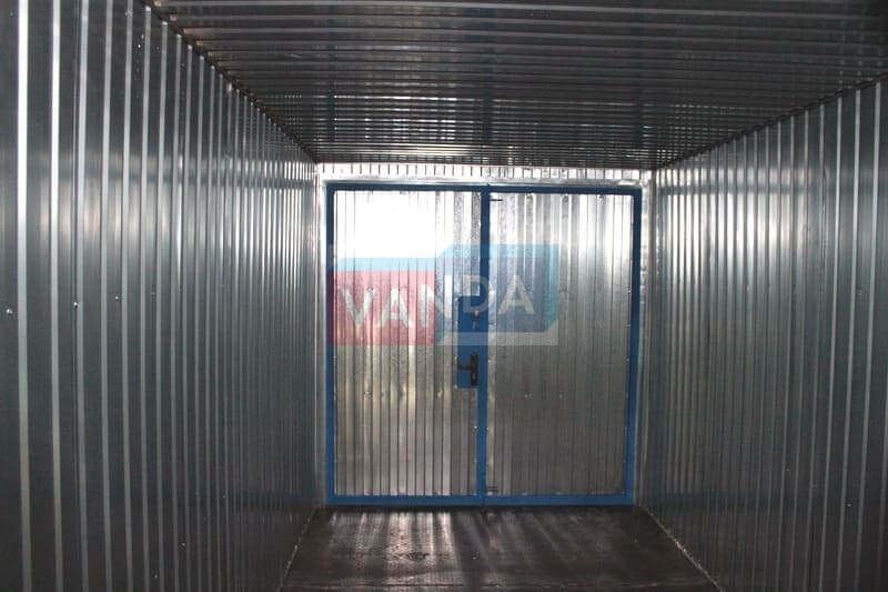 Бытовка под склад № 3 (Вариант 1) изготавливается из несущего каркаса (верхняя и нижняя обвязка): швеллер 100х50х3 мм., угловые стойки: сложно - гнутый угол 90х90х6 мм., крыша блок-контейнера: металл сварной 0,9-1 мм., качественная наружная отделка: оцинкованный профлист, внутренняя отделка стен: Оцинкованный профлист, внутренняя отделка потолка: Оцинкованный профлист, вспомогательный деревянный каркас (стены): брусок 40х75 мм., лаги пола: обрезная доска 40х100 мм., лаги потолка: обрезная доска 40х100 мм., выполнено утепление: Минеральная вата «ISOVER» – 50 мм. и пароизоляция: плёнка техническая, черновой пол состоит из: обрезная доска 20 мм. (2 сорт), чистовой пол покрыт: сухая, половая, шпунтованная доска 28 мм., отделка пола выполнена из качественных материалов. Контейнер комплектуется металлическими воротами.